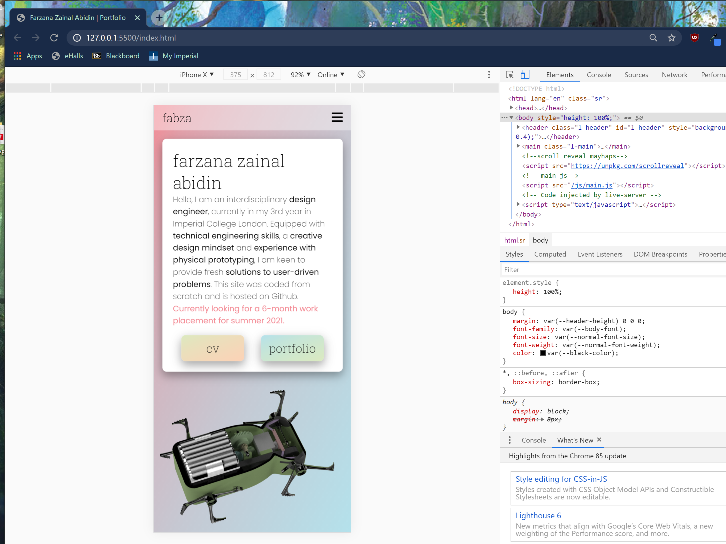 Hello, I am an interdisciplinary design engineer, currently in my 4th year in Imperial College London. Equipped with technical engineering skills, a creative design mindset and experience with physical prototyping, I am keen to provide fresh solutions to user-driven problems. This site was coded from scratch and is hosted on Github.
