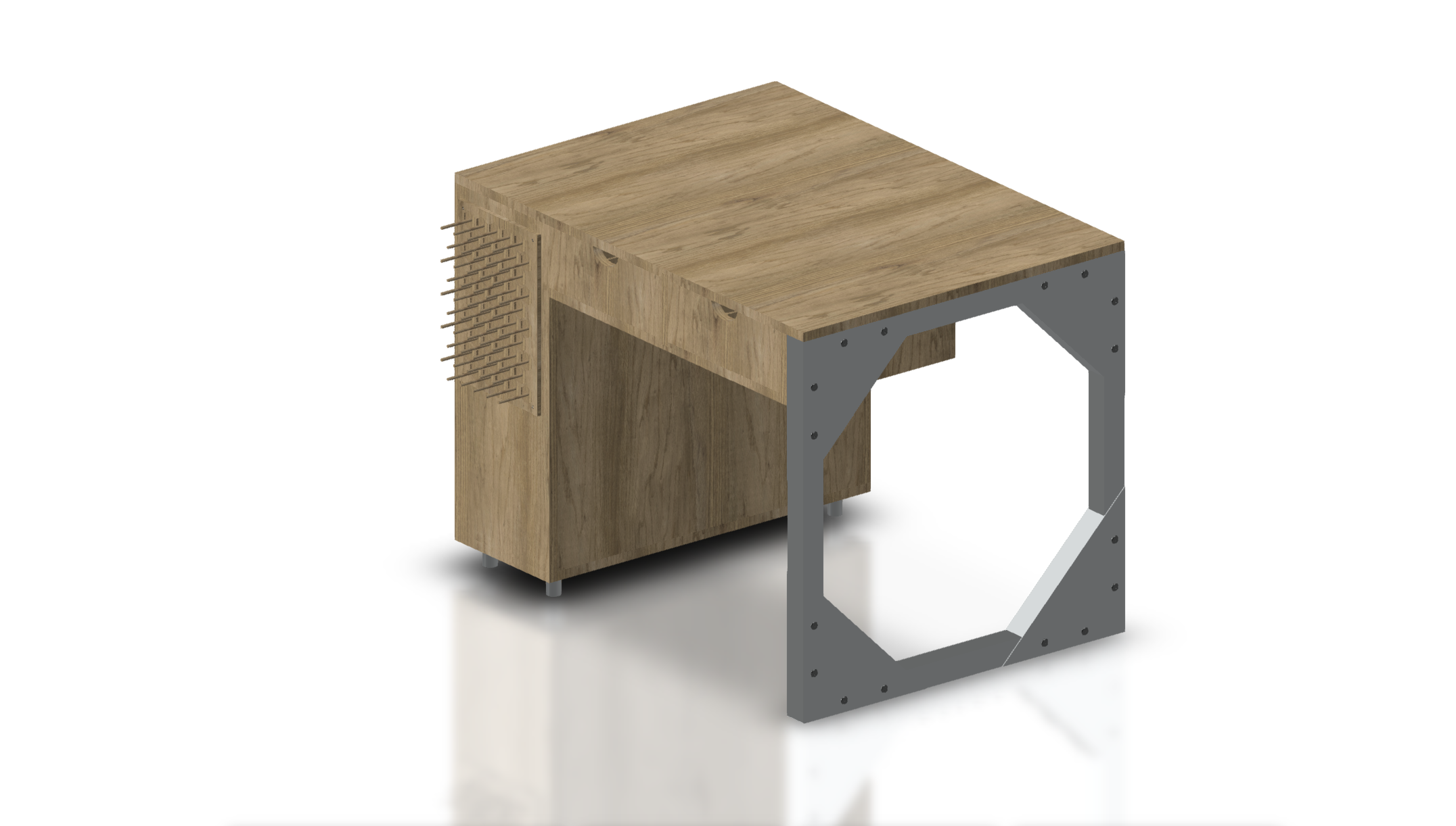 An 800x1100x820mm table consisting of drawers with built-in dividers, a specialised hanging storage for thread spools, three spacious shelves for supplies and an underlying geometric design theme present in the unique metal leg frame and spool storage. The project was conducted individually from initial project scoping and formulation of specification to CAD designs to manufacturing of physical final product.