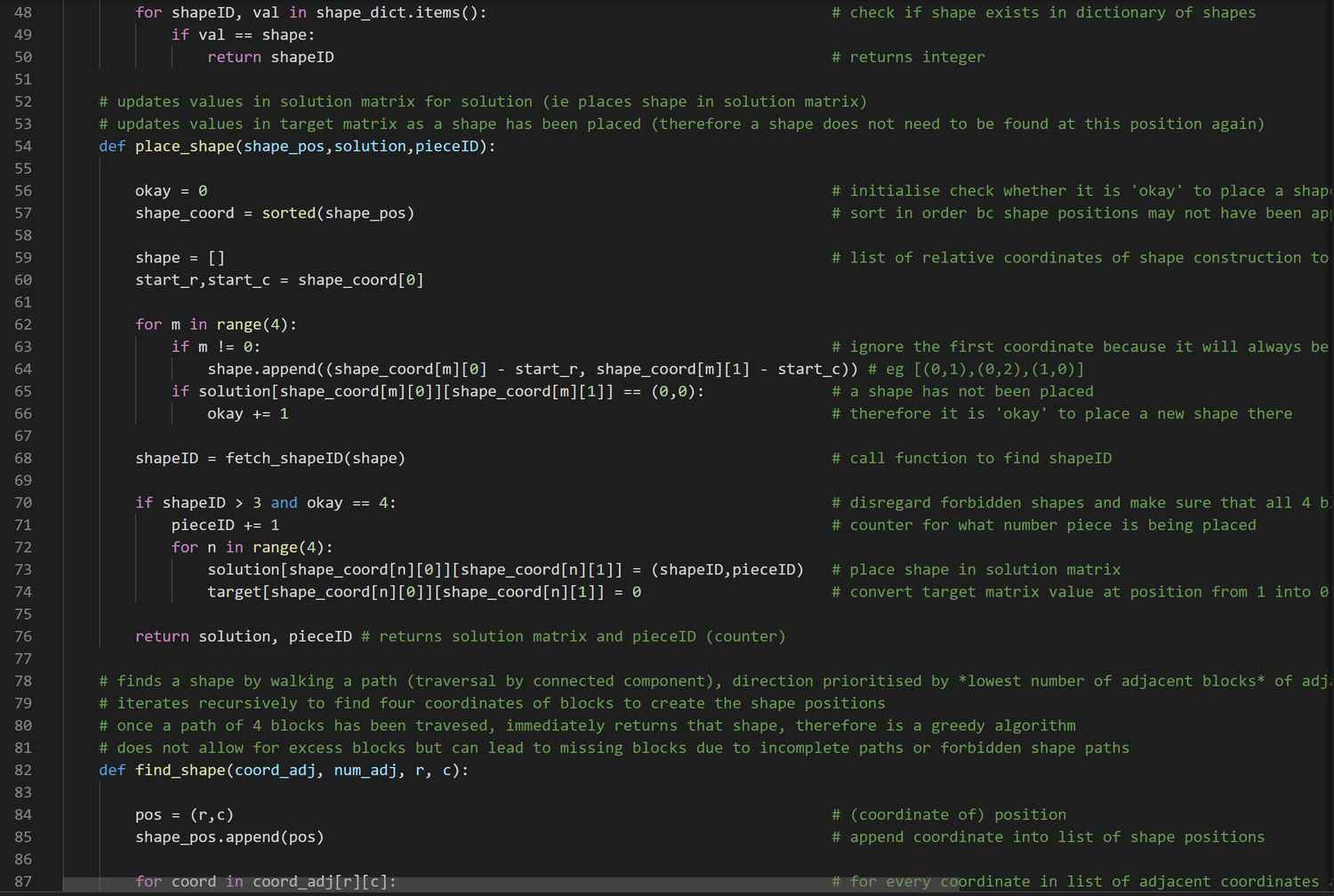 The final algorithm was coded in python and utilises reduction in order to fill puzzle. It consists of multiple sub functions focused on individual tasks called in the main loop to iteratively find the best solution based on connected node traversal and greedy principles. Data was stored in dictionary structures and matrices were used to represent the puzzle grid, Final performance reached average 90% accuracy in 5 seconds for a puzzle of 1000x1000 blocks.